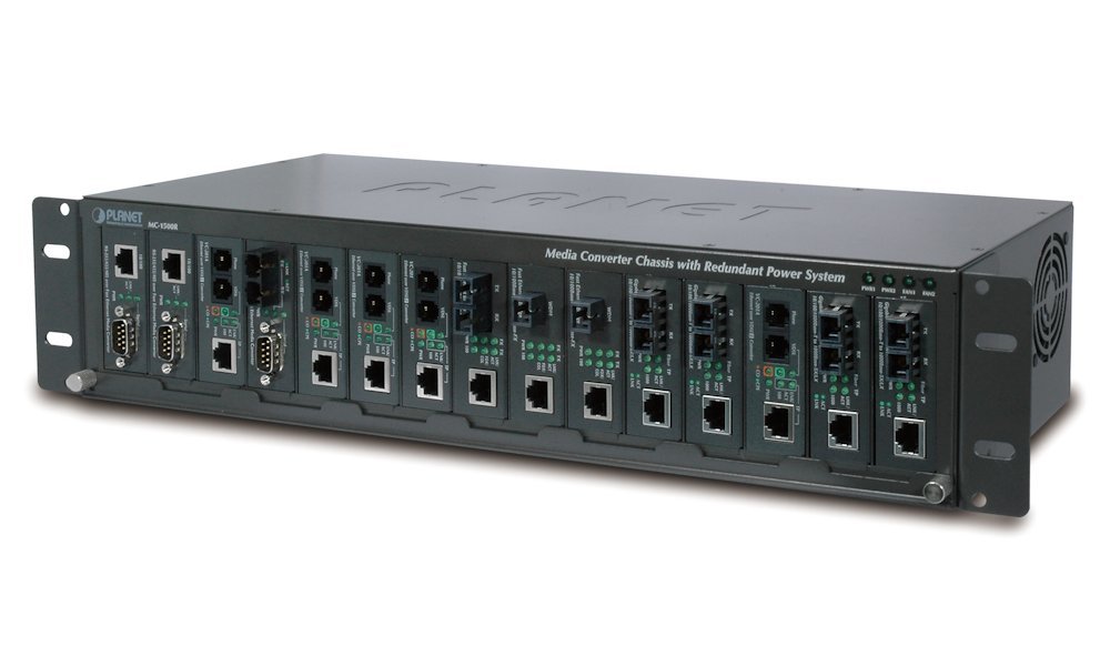 Kovové šasi pro instalaci až patnácti konvertoru médií do jediné skříně o výšce 2,5U. Skříň má vlastní napájení konvertorů a výrazně tak snižuje prostorové nároky konvertorů. Obsahuje slot pro redundantní napájení pro případ výpadku hlavního napájení. Důležité je i výkonné chlazení. Jednotlivé konvertory se snadno instalují zasunutím z čelní strany.