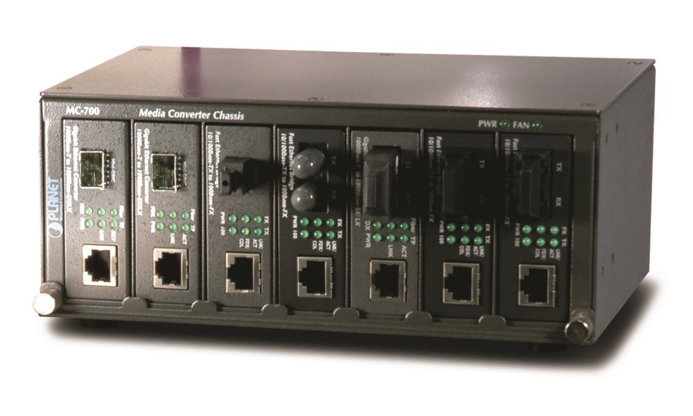 PLANET MC-700 7slotové šasi pro instalaci média konvertorů. Vnitřní napájení konvertorů, aktivní ventilace. Napájení AC 230 V, instalace 10" racku (výška 2U). Vlastnosti: 7 pozic pro standardní média konvertory... více