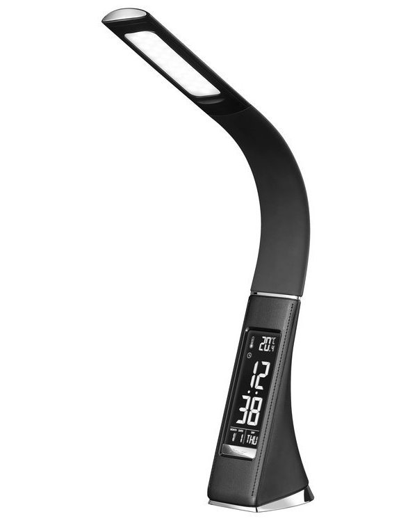 Moderní LED stolní lampička s ohebným ramenem, dotykovým ovládáním jasu a informačním LCD panelem, který zobrazuje údaje o aktuálním času, datu a teplotě. Pokud by vás LCD panel rušil, je možné jej úplně vypnout. Napájení je realizováno skrze přiložený adaptér, nebo přímo z USB portu počítače či powerbanky. Součástí balení je USB kabel o délce 120 cm.