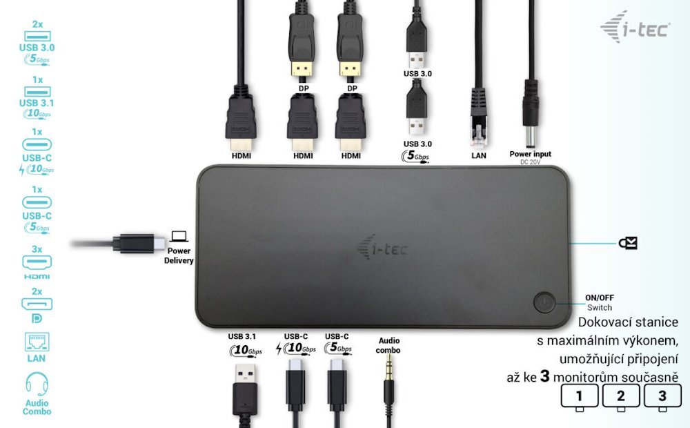 Dokovací stanice nabízející velké množství praktických portů. Připojení k počítači je realizováno skrze USB-C kabel s podporou Thunderbolt 3. Stanice taktéž nabízí USB-C Power Delivery až 100 W, který je určen pro napájení připojeného notebooku či tabletu pomocí vašeho originálního síťového adaptéru. K dokovací stanici lze připojit až tři monitory skrze rozhraní HDMI či DisplayPort s maximálním rozlišením až 4K. Připojení ke třem monitorům však bude možné pouze v případě notebooku s portem Thunderbolt 3/4, případně USB-C portem podporujícím přenos videa. Samozřejmostí jsou tři USB porty, spolehlivé a rychlé připojení k internetu díky integrovanému LAN portu a nechybí ani podpora audio vstupu/výstupu. Dokovací stanici lze nainstalovat i dozadu za monitor s podporou VESA uchycení díky VESA držáčku (není součástí), čímž získáte jak maximální pracovní efektivitu díky rozšiřitelnosti portů, tak i krásně uklizený stůl bez kabelů.