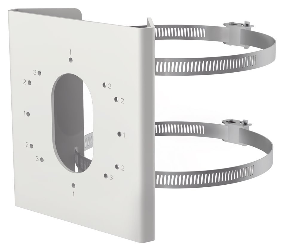 Držák pro montáž kamer na sloup/trubku, zatížitelnost 10 kg. Použitelné na trubku průměru 67 až 127 mm. Trubka musí unést více než 3krát větší hmotnost, než je celková hmotnost kamery a držáku.