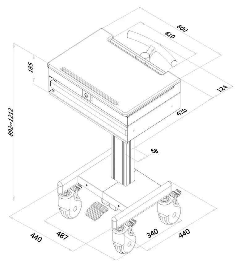 Pojízdný stojan pro notebook s úhlopříčkou do 17", klávesnici a myš s celkovou hmotností 5 kg. Umožňuje snadné nastavení výšky v rozsahu 89,2 až 121,2 cm. K dispozici je také bezpečný uzamykatelný šuplík a systém pro vedení kabelů. Veškerý instalační materiál je součástí výrobku.