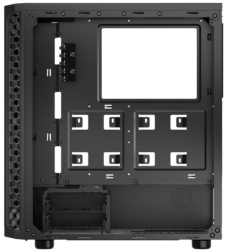 Skříň formátu Middle Tower s průhlednou bočnicí z tvrzeného skla nabízí dvě 2,5" pozice pro SSD disky a dvě 3,5" pozice pro pevné disky. Na horní části se nachází dva USB 3.0 porty, sluchátkový výstup a audio vstup pro mikrofon. Vybavena je dvěma 120 mm ventilátory, které spolu s perforovaným čelním panelem zajišťují dostatečné proudění vzduchu. Důmyslné řešení umožňuje pohodlné umístění až 360 mm dlouhého výměníku vodního chlazení na přední straně. Ve skříni je dostatek prostoru pro chladič CPU do výšky až 161 mm a grafickou kartu o délce až 325 mm. Dodávána je bez zdroje. Součástí je také sada prachových filtrů.