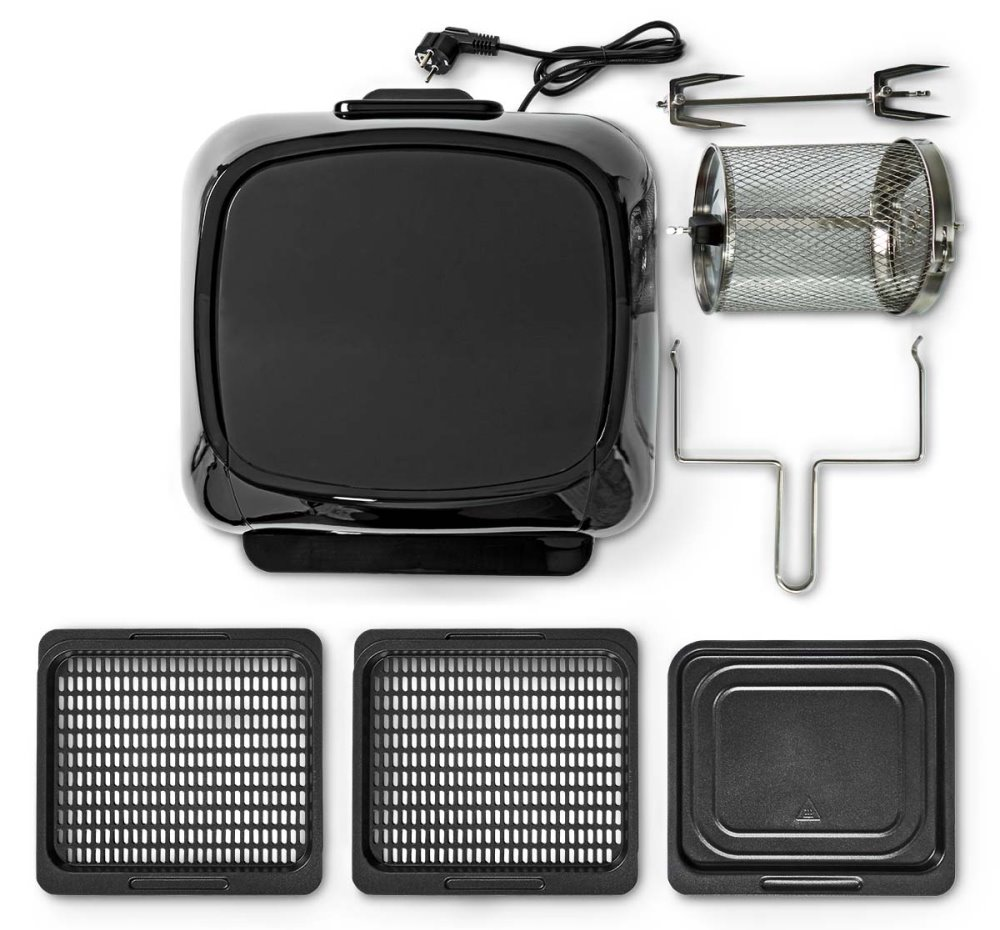 Součástí balení je pečicí deska/deska pro odkapávání oleje, 2× grilovací mřížka, rožeň na kuře, držák rožně a rotační bubnový koš.