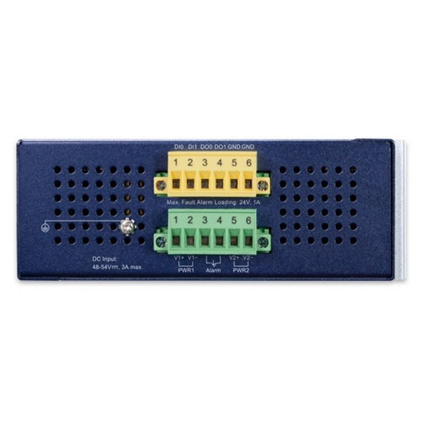 Instalace na zeď nebo na DIN, kovové provedení IP30, DI/DO rozhraní (2× vstup, 2× výstup), RS-485 (3pólová svorkovnice), napájení DC 48-54 V, provoz při -40 až 75 °C, bez ventilátorů (fanless).