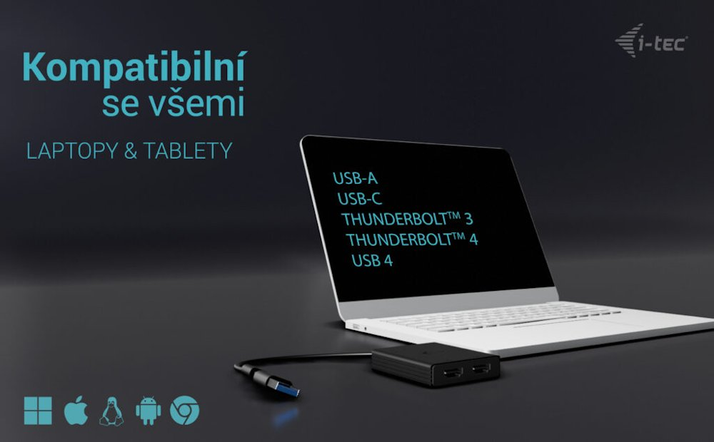 Video adaptér, který umožňuje rozšíření vaší pracovní plochy o dva externí HDMI monitory. Připojení lze jednoduše realizovat skrze konektor USB-A či USB-C s podporou USB 4.0 a Thunderbolt 3/4. Adaptér podporuje přenos rozlišení 4K při 60 Hz včetně zvukového signálu.