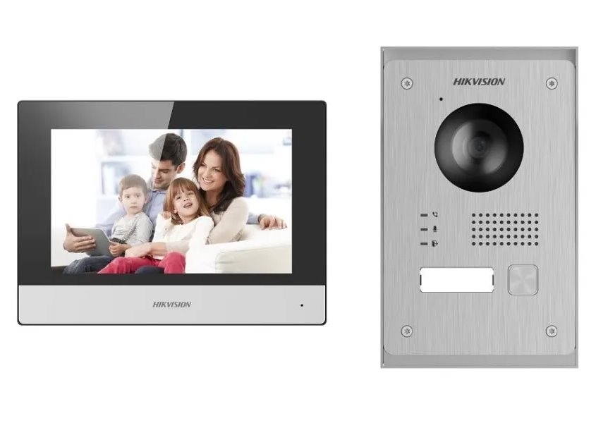 Sada videointerkomu pro 2drátový systém. Součástí je bytový monitor, dveřní stanice (jednotlačítkový interkom) a napájecí zdroj.