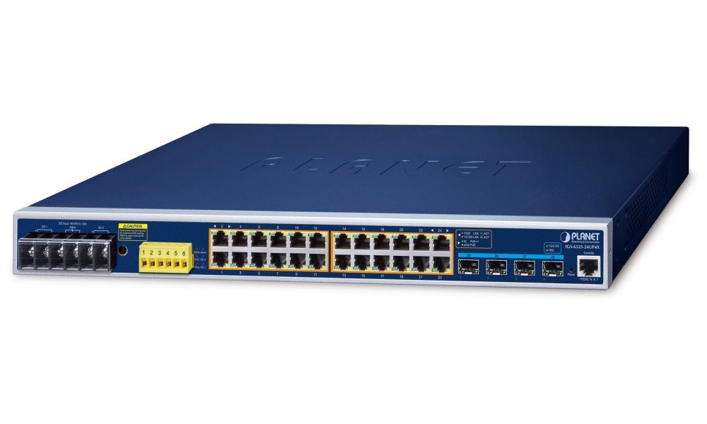 Porty: 24× GbE RJ-45, 4× 10G SFP+, 1× konzolový port RJ-45 (RS-232), 2× digitální vstup DI, 2× digitální výstup DO, 1× alarm výstup (relé)
