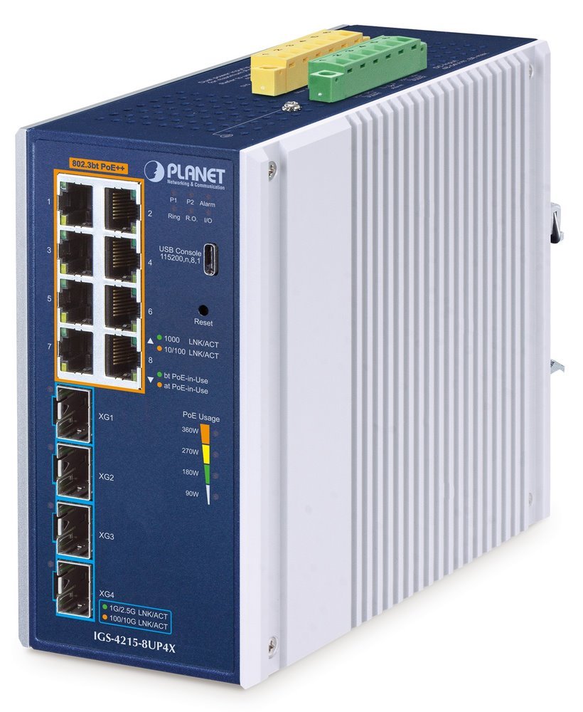 Průmyslový PoE++ spravovatelný switch s 8× RJ-45 10/100/1000 Base-T, 4× 10G Base-SR/LR SFP+ (diagnostika SFP-DDM), 2× digitální vstup DI, 2× digitální výstup DO. Porty 1-8 podporují PoE++ napájení (802.3af/at/bt), celkový výkon 240/360 W (podle vstupního napájení).