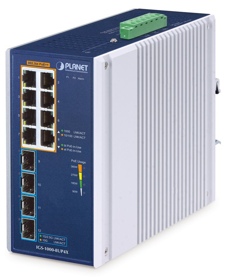 Nespravovaný průmyslový L2 PoE++ switch s 8× RJ-45 10/100/1000 Base-T a 4× 10G Base-X SFP+. Porty 1–8 podporují PoE++ napájení (802.3af/at/bt), s celkovým výkon až 360 W.