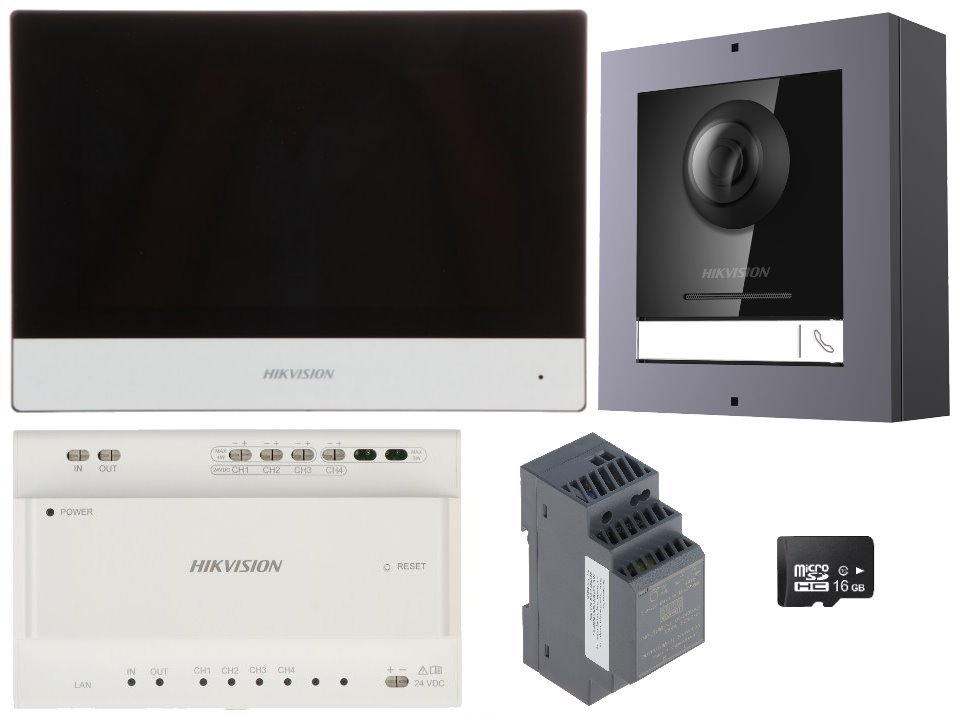 Sada videointerkomu pro 2drátový systém. Součástí je bytový monitor, dveřní stanice (jednotlačítkový interkom), distributor, napájecí zdroj a 16GB microSD karta.