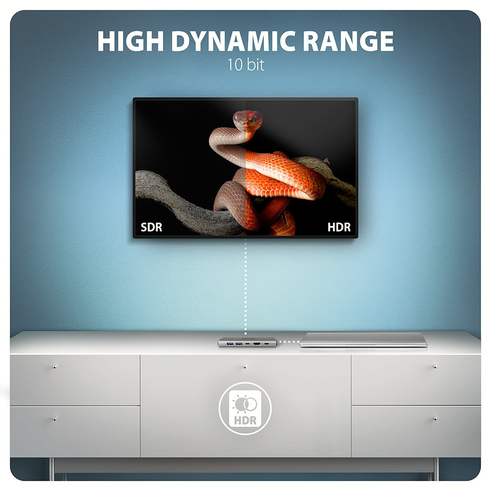 Dokovací stanice v hliníkovém provedení rozšíří váš notebook, počítač nebo telefon s USB-C rozhraním o šest portů. HDMI výstup poskytuje kvalitní obraz až do rozlišení 4K při 60 Hz a podporu HDR pro výrazně rozšířený rozsah barev a kontrastů. Podporovány jsou také vysoké frekvence 2K při 120 Hz nebo Full HD při 240 Hz. Pro připojení periférií jsou přítomny dva USB 3.1 porty a jeden USB-C port s rychlostí přenosu dat až 10 Gb/s. Druhý USB-C konektor je vyhrazen pouze pro vstup napájení, pro dobíjení připojeného zařízení pomocí technologie Power Delivery 3.0 výkonem až 100 W. Podmínkou je notebook s podporou nabíjení z USB-C portu pomocí Power Delivery a vhodná PD nabíječka. Vysokorychlostní přístup k internetu lze realizovat skrze přítomný gigabitový RJ-45 port. Elegantní hliníkové tělo zajistí nejen mechanickou odolnost, ale i pasivní chlazení. Kvalitní stíněný kabel zaručuje vysokou rychlost komunikace a minimální nežádoucí interference.
