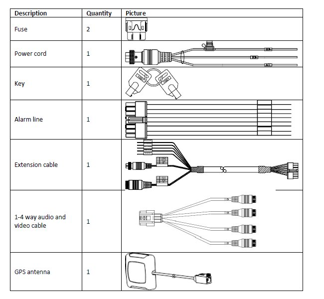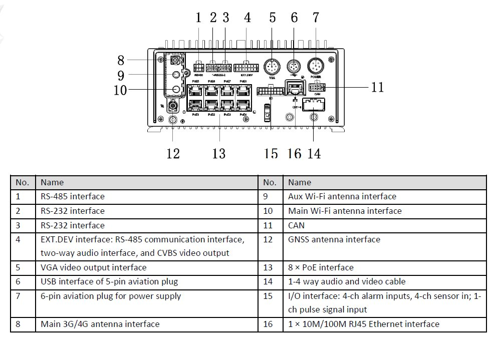Porty: 8× RJ-45 (PoE podpora), 2× USB 2.0 (z toho 1× 5pin letecká zásuvka), 2× RJ-45 (10/100 Mbps), 1× RS-485, 2× RS232, 1× EXT.DEV rozhraní, 1× VGA výstup, 1× 4kanálové audio/video rozhraní, 1× I/O rozhraní (4× alarm vstup, 4× vstup pro senzor, 1× vstup pulzního signálu), 1× CAN rozhraní, 1× SD slot, 3× konektor antény (Wi-Fi, GNSS a 3G/4G)
