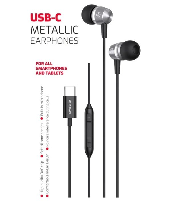 Drátová sluchátka SWISSTEN Metallic s konektorem USB-C, která vám zprostředkují kvalitní a čisté audio na cestách. Součástí je také mikrofon umístěný na ovládacím panelu, takže můžete pohodlně přijímat a absolvovat telefonní hovory. S pomocí multifunkčního tlačítka tak ovládnete hudbu i telefonování. Sluchátka SWISSTEN Metallic potěší svým bytelným zpracováním s kovovými prvky. Jsou elegantní na pohled, patřičně odolná a také podporují perfektní podání zvuku bez zkreslení.