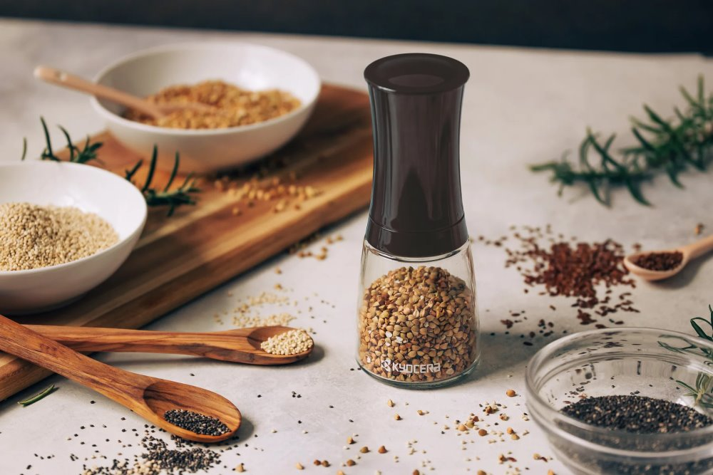 Mlýnek na bylinky a koření od společnosti Kyocera je vybaven nastavitelnými keramickými mlecími kameny, které jednoduše melou a drtí koření na požadovanou jemnost, aniž by při tom změnily jeho chuť.