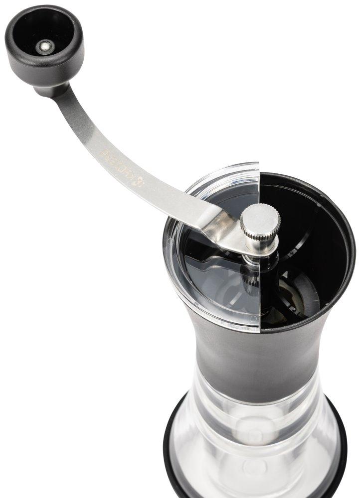 Keramický mlýnek na kávu s akrylovou základnou a kapacitou 30 g mleté kávy.