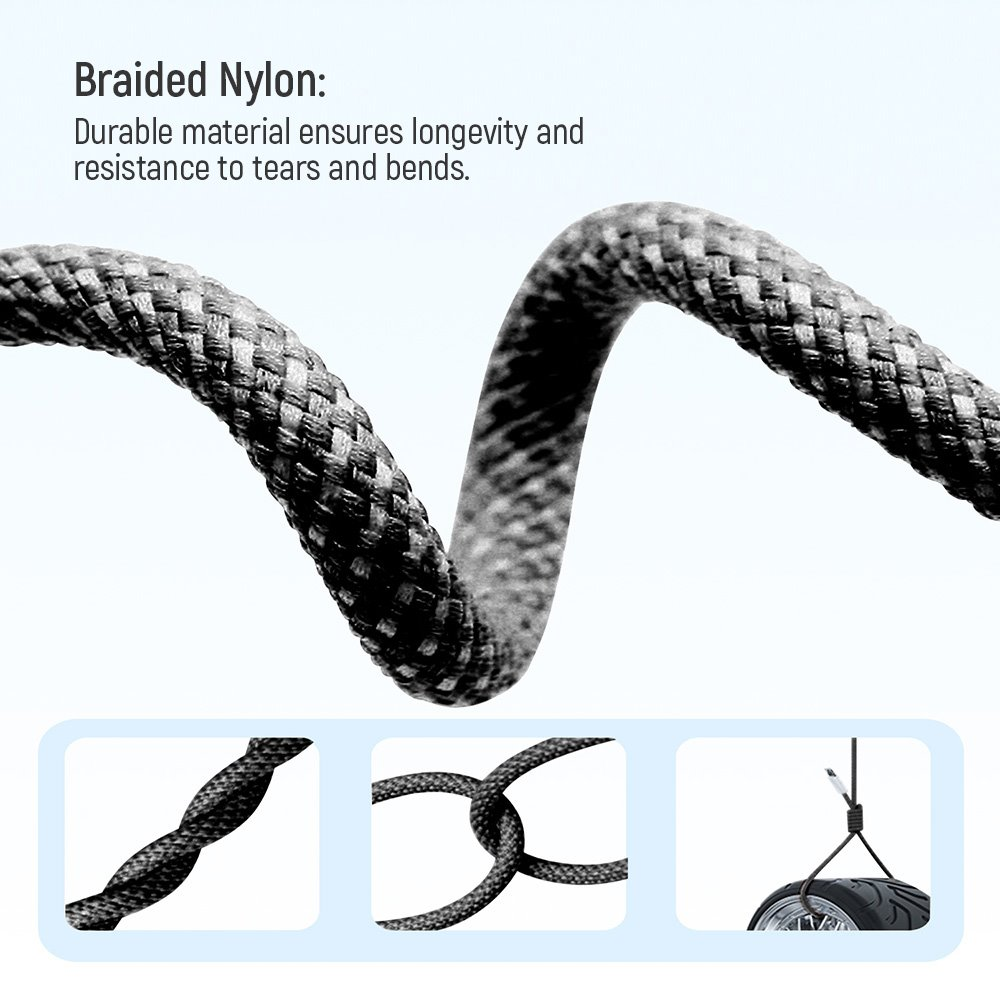 Odolné pletené provedení z nylonu chrání kabel před opotřebením během dlouhodobého používání. Integrovaný inteligentní čip automaticky reguluje proud a poskytuje ochranu proti přepětí a zkratům. Délka 1 metr umožňuje pohodlné používání doma, v kanceláři i na cestách.