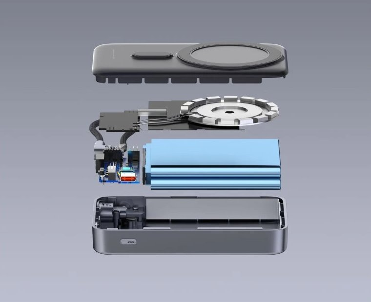 Powerbanku lze nabíjet přes USB-C port nebo přes integrovaný USB-C kabel, oba vstupy podporují rychlé nabíjení až 20 W (5 V 3 A, 9 V 2,22 A, 12 V 1,67 A).