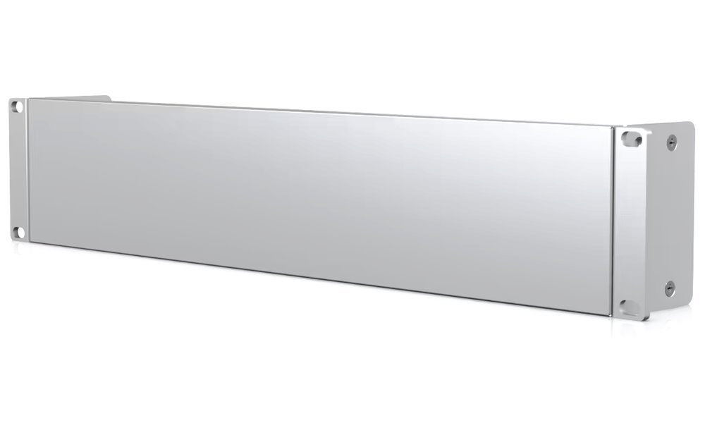 Single blank panel with a height of 2U, easily installable into existing network device racks, creating a clean and uniform aesthetic appearance.