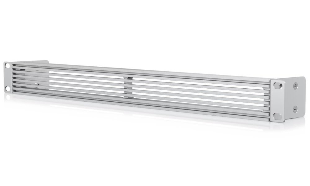 Single panel with a ventilation grille, 1U in height, easily installable into existing network device racks, creating a clean and uniform aesthetic appearance.