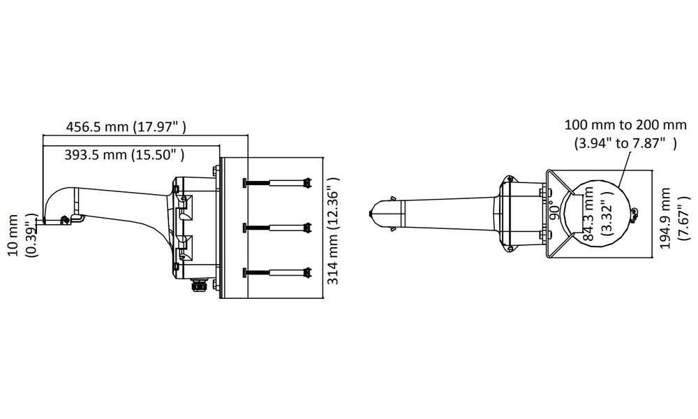 Vertical bracket with mounting box for mounting PTZ dome camera on a pole, load capacity 10 kg. The bracket is suitable for indoor and outdoor use and should be installed on a pole with a diameter of 100-200 mm. The pole must support more than 3 times the total weight of the camera and bracket.